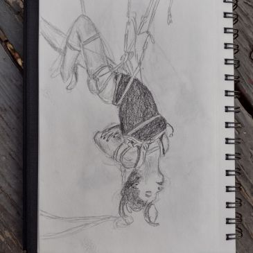 The model and his partner walk out to the middle of the circle. Several chairs are circling the stage. We all watch intently, all focused on the two people now standing on top of the stage. He has a chest harness made of rope that bounds his arms tucked in front of him. The woman … More Drawing Shabari